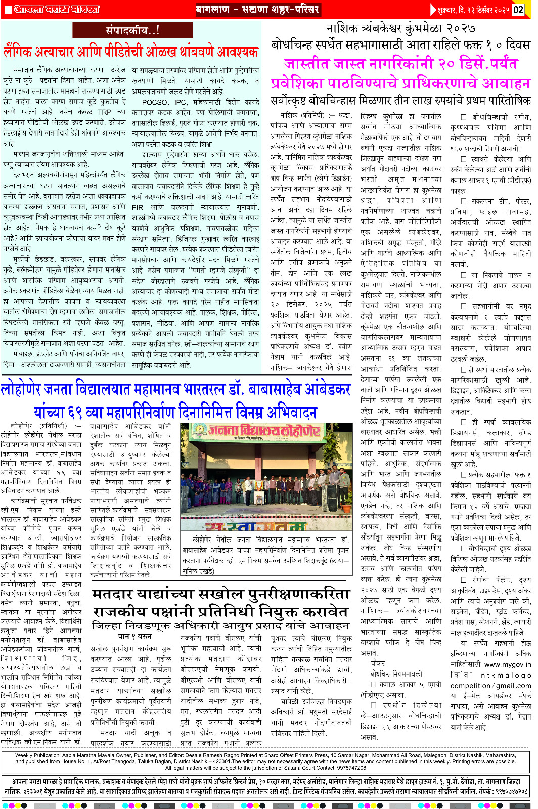 मतांसाठी या वेबसाईटची संपादकीय टीम थेट जबाबदार नाही.आरोप / तक्रार / जनहित माहितीबाबत — संबंधित विभाग / संस्था / अधिकारी / व्यक्ती कडून अधिकृत प्रतिक्रिया घेण्याचा प्रयत्न केला जातो. चूक अथवा सुधारणा